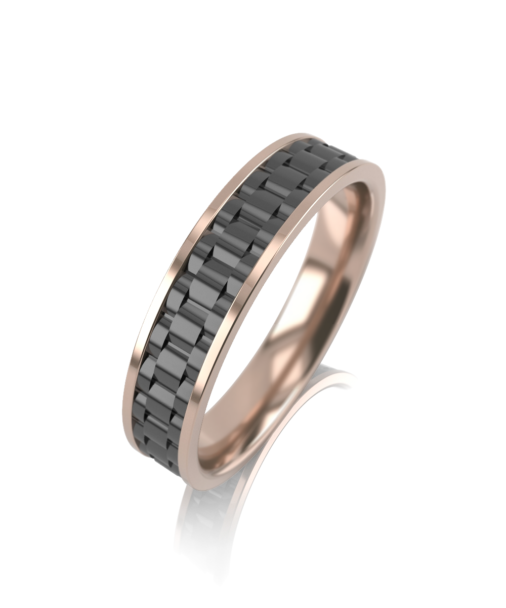 Обручальное кольцо, выполненное из красного золота 585 пробы в сочетании с черной керамикой, которая имеет оригинальную текстуру.