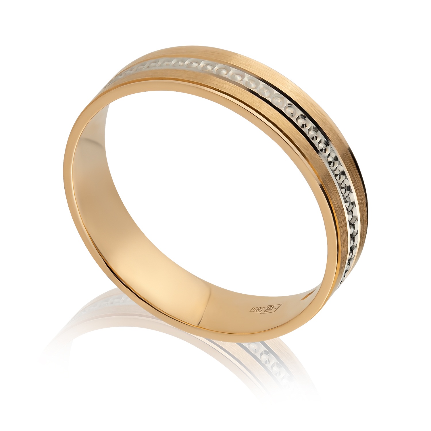 Обручальное кольцо из красного золота 585 пробы с алмазной обработкой. Изящество изделию придаёт покрытие нежным белым родием.