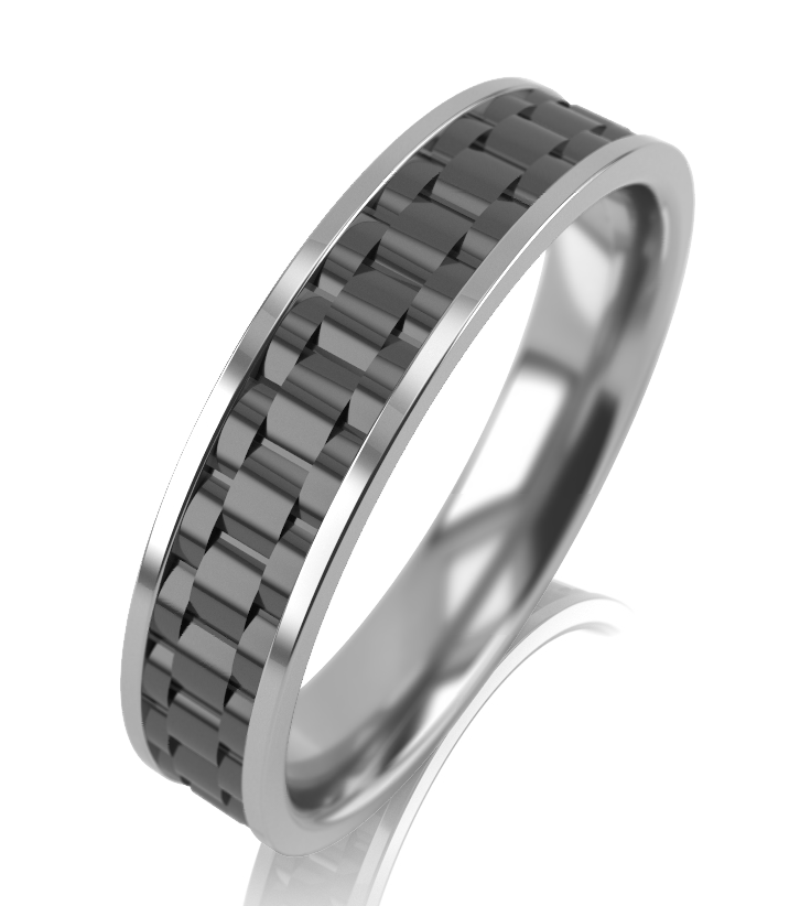 Обручальное кольцо, выполненное из белого золота 585 пробы в сочетании с черной керамикой, которая имеет оригинальную текстуру.