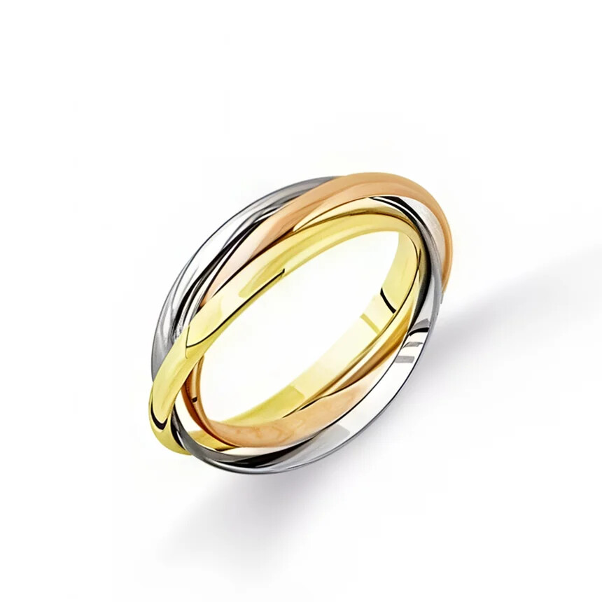 Оригинальное обручальное кольцо, выполненное в сочетании трех цветов золота 585 пробы. Это украшение с глубоким символическим значением. Его классический вариант представляет собой комбинацию из 3-х тонких колец разного цвета, символизирующих любовь, дружбу и верность.Ширина изделия- 2 мм.