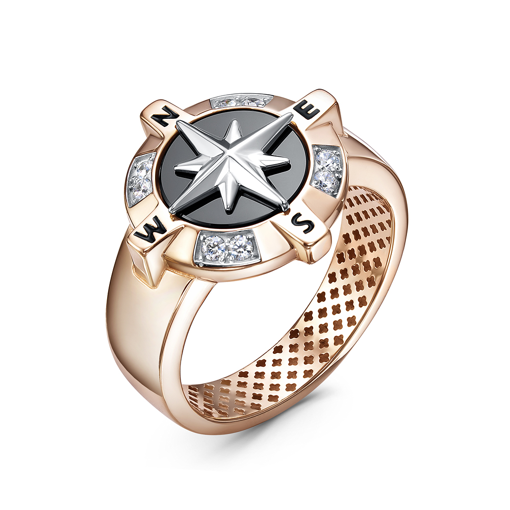 Печатка мужская из красного золота с ониксом и фианитами 034911
