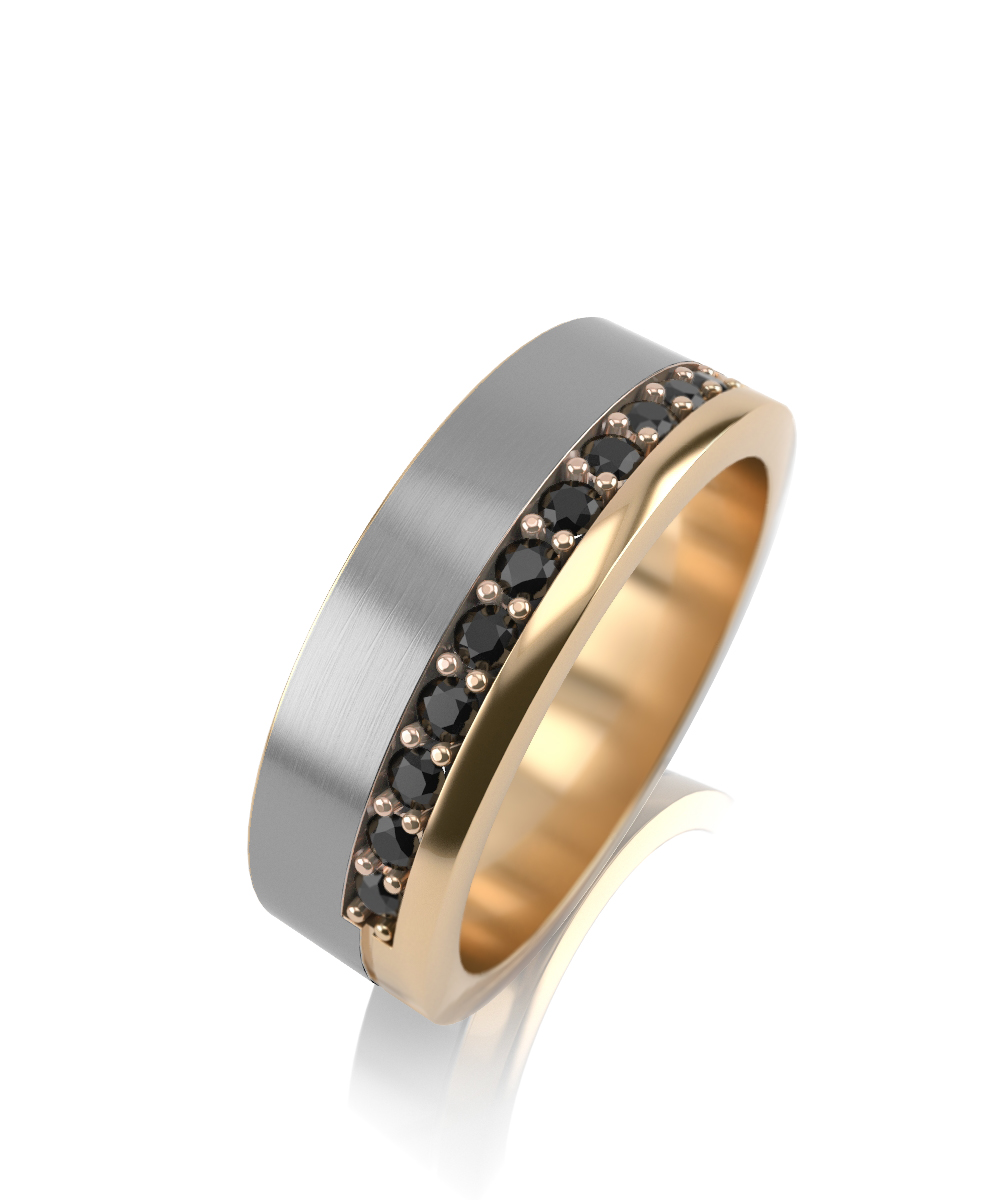 Обручальное кольцо, выполненное в сочетании белого и желтого золота 585 пробы, украшенное россыпью черных бриллиантов.