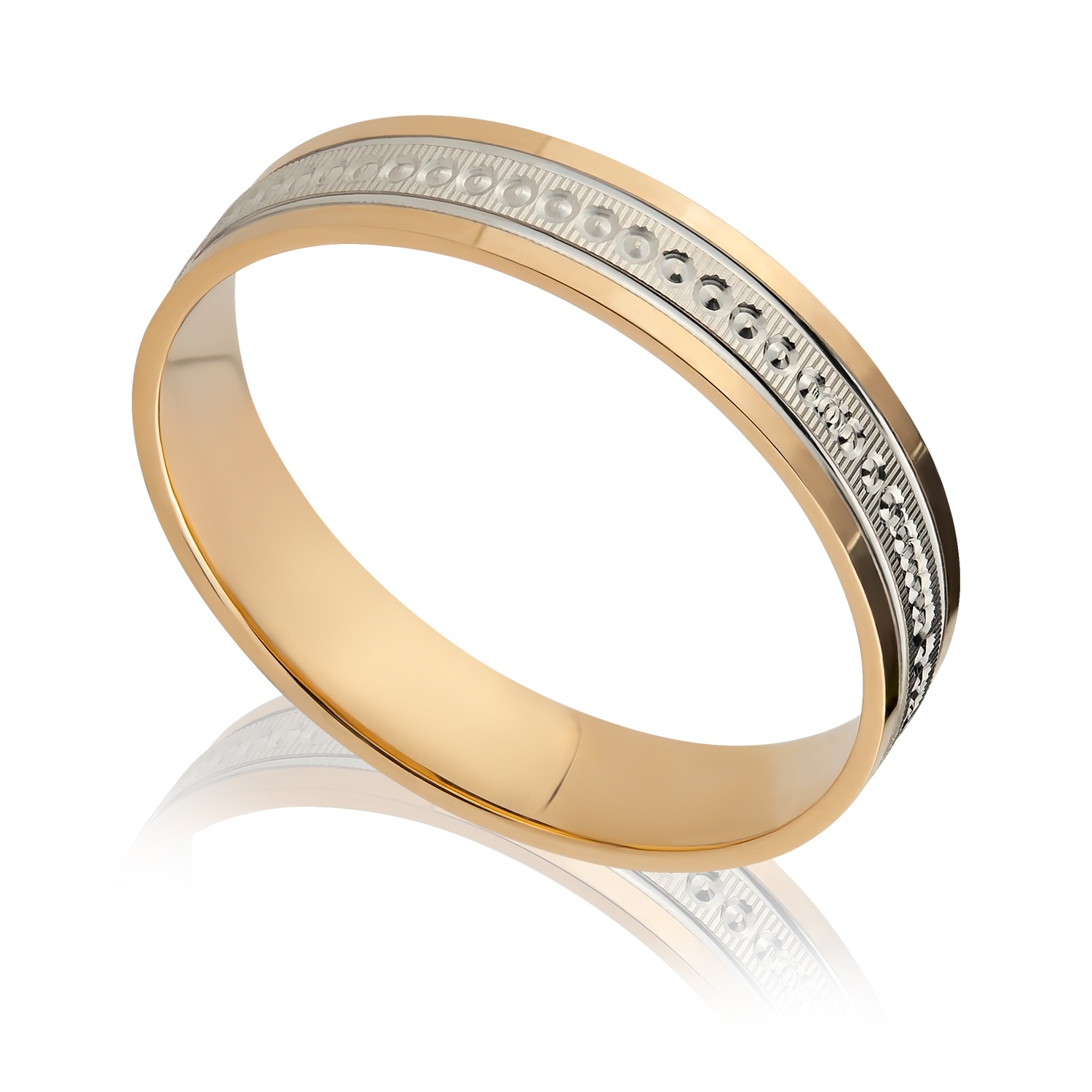 Обручальное кольцо из красного золота 585 пробы с алмазной обработкой. Изящество изделию придаёт покрытие нежным белым родием.