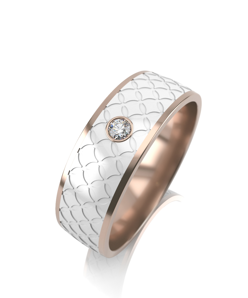 Обручальное кольцо из красного золота с белой керамикой и бриллиантом. Благодаря особой технологии производства керамика приобретает характерный блеск и прочность. Царапин и сколов Вы никогда не увидите. Центр кольца украшен природным бриллиантом.