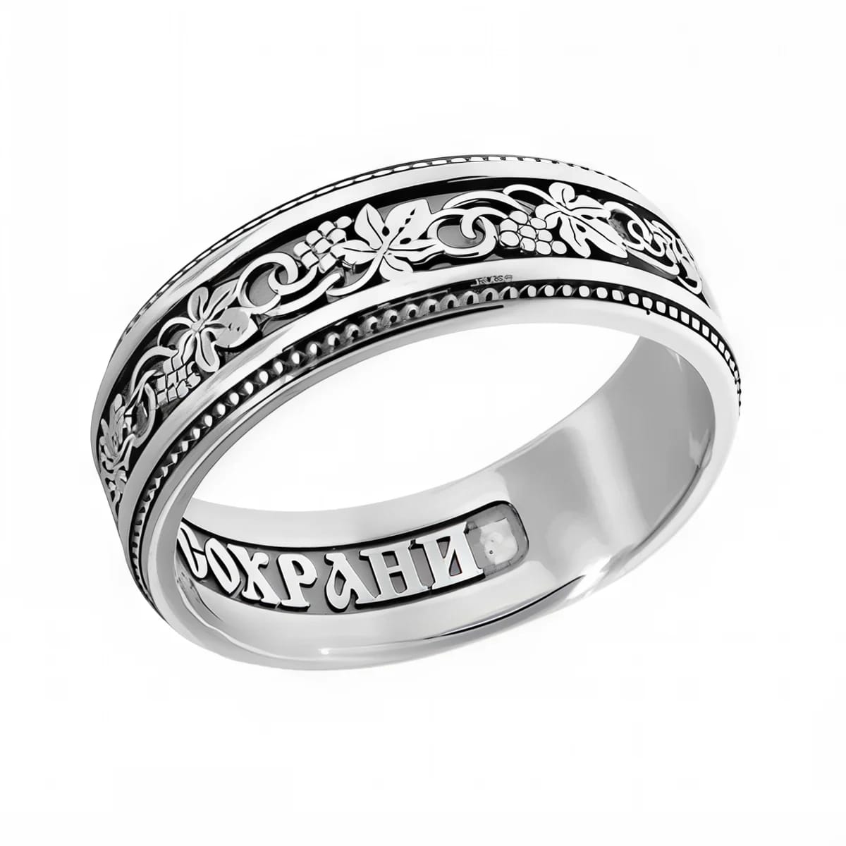 Ювелирное серебряное православное кольцо «Спаси и Сохрани». Изделие ОСВЯЩЕНО! Выполнено из серебра 925 пробы. Покрытие - оксидирование. Ширина кольца – 6 мм. Минимальный вес изделия 4,17 гр. Кольцо украшено виноградом и сокращенной молитвой обращенной ко Господу: " ГДИ, Спаси и Сохрани мя" спрятанной от посторонних глаз. Эта молитва знакома каждому, она очень проста, но в то же время очень емка. Колечко напомнит, что христианину всегда есть к кому обратиться. Это — обращение к Господу и искренняя вера в Его помощь и заступничество, даже в самой безнадежной ситуации. Мы знаем, что спасение для нас есть только во Христе. Сохрани — значит огради нас от опасности. Не существует специально отведенного времени, когда надо было бы читать молитву «Спаси и Сохрани». Она будет уместна в любое время. Молитву «Спаси и Сохрани» часто читают в момент угрожающей опасности, когда от страха и волнения текст другой молитвы сложно вспомнить. «Спаси и Сохрани» всегда в душе человека.
